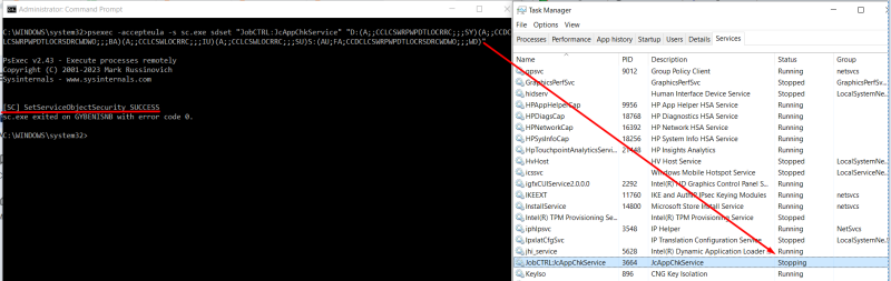 psexec -accepteula -s sc.exe sdset “JobCTRL:JcAppChkService” ”<original ACL here>”