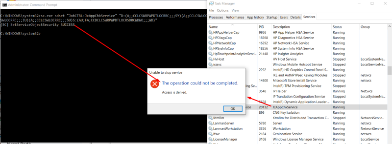 sc.exe sdshow “JobCTRL:JcAppChkService