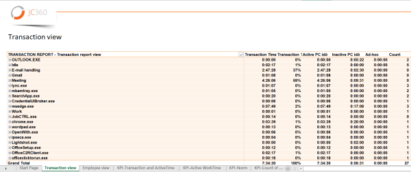 | The transaction report connects elementary activities to higher-level business reports in the structure hierarchy above. All the indicators used in the analyses so far can be dug down to this depth in order to identify individual causes. The underlying logic of the transaction report must be parametered for each process, but this is practically possible by defining the entry points and the applications used in the process, in a few hours. The report can be called by e-mail for any period of time. |