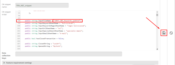 It's important to name it TRN_ABC_snippet, because that's how the report refers to it. When saving, make sure that, when you have copied the script name, there should be no space before or after it, because unfortunately it will not be recognized by the report. You don't need to fill the feature requirement settings and the data collection keys, because we've already set it up for the report recently.
