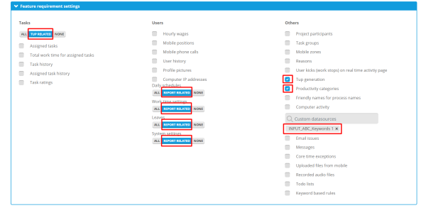 When we're done, next step is to set up the Feature requirement settings. I think the best way to explain that settings is to send you a picture of them. You will need to select the already uploaded TRN_ABC_Keyword excel.