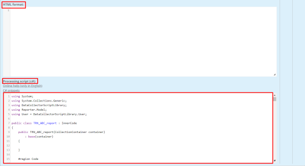 For the script adjustment, please open the TRN_ABC_report document. Copy the entire text, delete the default script and paste it into the box. Also, please delete the text from the html format's box, because we won't be able to use it. The page should now look like this.