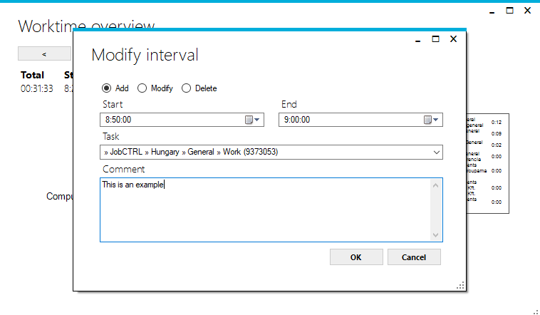 Here you can select if you want to add/delete/modify worktime by selecting a task and adding some description why you want to modify. You can also change the time if it isn't the exact period you want to change (if you select the “delete” the task won't be visible).