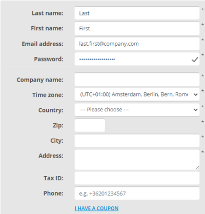 New company can be registered easily from the website. Simply click on the “Free trial” button.