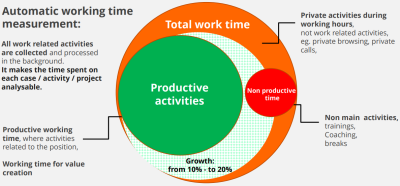 - Working time is measured automatically, making work processes transparent, with automatic online calculation of productivity.