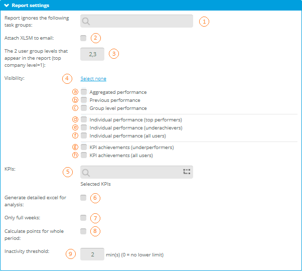 | Based on the selected KPIs the report measures the performance on corporate level. Due to easier comparison the report contains values from previous periods. This way you can easily evaluate if your employees performance increased or decreased. The overall, group and individual score calculations are based on the KPI's weight. |