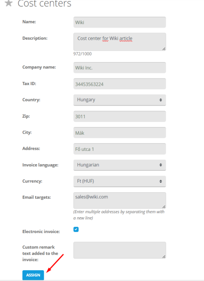 | On this page, additional cost centres can be created (over the default one, which can be found at the bottom of the company details page) and managed to help our customers who, although using one registration, would like to request an invoice issued after using the service to a different billing address per departments or usergroups |