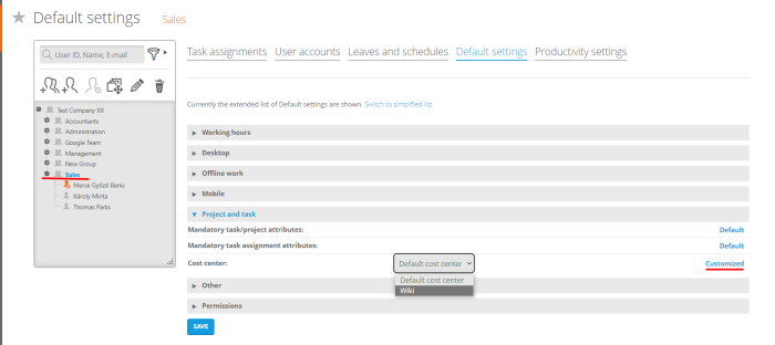 The option for the cost center assignment will be visible at the Default settings page, inside the Project and task tab. The minimum requirement is to have at least one cost center created the way as it is listed above, in order to have the setting available. Select the appropriate group or user from the user hierarchy (from the left side of the page) and you will be able to do manage the cost center assignment.