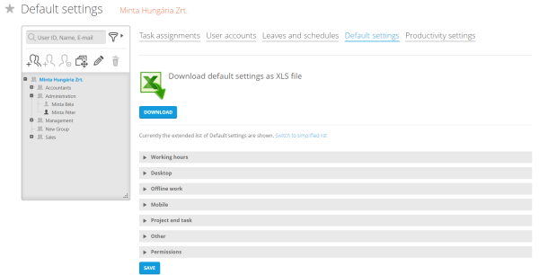 | Administrators can customize settings in the default settings menu, just as they expect jc to work properly. The modifications can be made for company level, group level or even user level. To select the appropriate hierarchy level, you can find the company hierarchy on the left side of the page, supplemented with a search box above it. |
