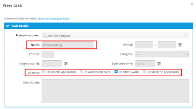At the Edit tasks and projects tab, you can create new tasks under any of your projects by selecting the New Task function. Once you clicked on it, a pop-up window will appear which you need to fill out with the correct details for the offline task. Required fields are marked in bold. As soon as you press the safe button, the task will be created.
