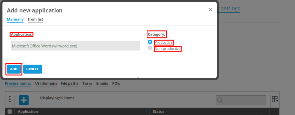 If you're adding a new app manually, type the name of the app that you want to make productive, for example, Microsoft Office Word (winword.exe), then you can choose if this app is a productiv or a non-productive categorie. When you're done, press the “Add” button.