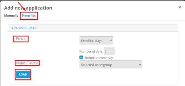 If you already have data collected, you can list the most used NON-productive apps. In this case, click “From List.” Set the time period for which you want to retrieve the data and select the users. By clicking on “Load”, JC360 lists the most commonly used, not yet productive Applications.