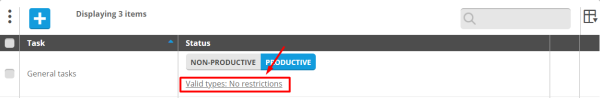 By default, the task will be productive for all types, but this option allows you to limit the task to the JC productive only according to the selected checkboxes (in this case, the Work task will only be productive if adhoc offline and amnual working hours are recorded.) To unlock this menu, click “Valid types: no restrictions”.