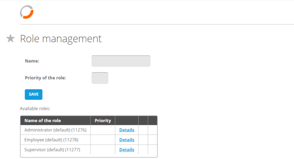 The creature is pretty easy, just give a name and a priortity between 0 and 10000 and press save. The roles will be sorted depending on the priority. Default settings and assigned users can be managed for each of the manually created roles after clicking on the Details option.