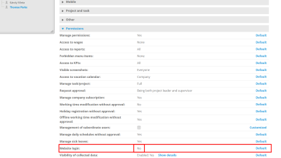 • The second in line is the evaluation by roles, the changes defined on this page can only override the settings defined at company level (for the root element) (e.g. → Web access is allowed at company level (on the default settings page), but I manage to disallow this permission for the employee role (roles page), the following will happen