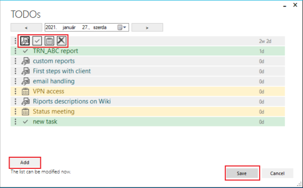 The TODO pop-up window will show up, and it will be very similar to the website's window. You can set the date at the top and manage your tasks underneath. You can change the tasks status by clicking on the symbol next to them. When you are ready, click the save button.