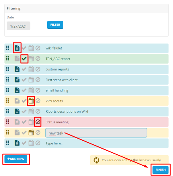 | ToDo is an additional service that can be requested from support. You can put your current tasks on it. You can classire these tasks into 4 different statuses. There is an open status, finished status, postponed status and canceled status. Each status has its own recognition signal, so that we can easily distinguish them from each other. |